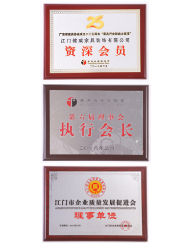 荣获“广东省家具协会资深会员”、“广东省家具协会第六届理事会执行会长”、“江门市企业质量发展促进会理事单位”称号;“ISO9001:2008”、“ISO14001:2004”认证。