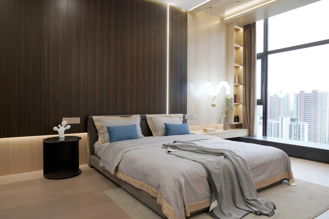 卧室选用了胡桃木+尤加利结合的木饰面设计,在深浅相宜的平衡中,交叠出从容有序的层次美感。